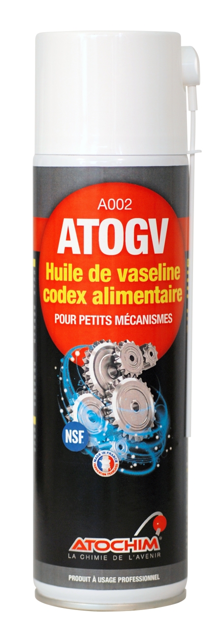 ATOGV est un lubrifiant polyvalent pour les petits mécanismes à base d’huile minérale codex, incolore, inodore et sans saveur. ATOGV est spécialement formulée pour la petite lubrification en milieu alimentaire (industrie, cuisine…). ATOGV est également utilisable en tant qu’agent de démoulage sans silicone et agent de glissement et elle possède de bonnes propriétés contre la corrosion et l’adhérence. Tous les composants de cette formulation aérosol ont été homologués par les organismes européens InS et américains NSF pour un contact fortuit avec les aliments.